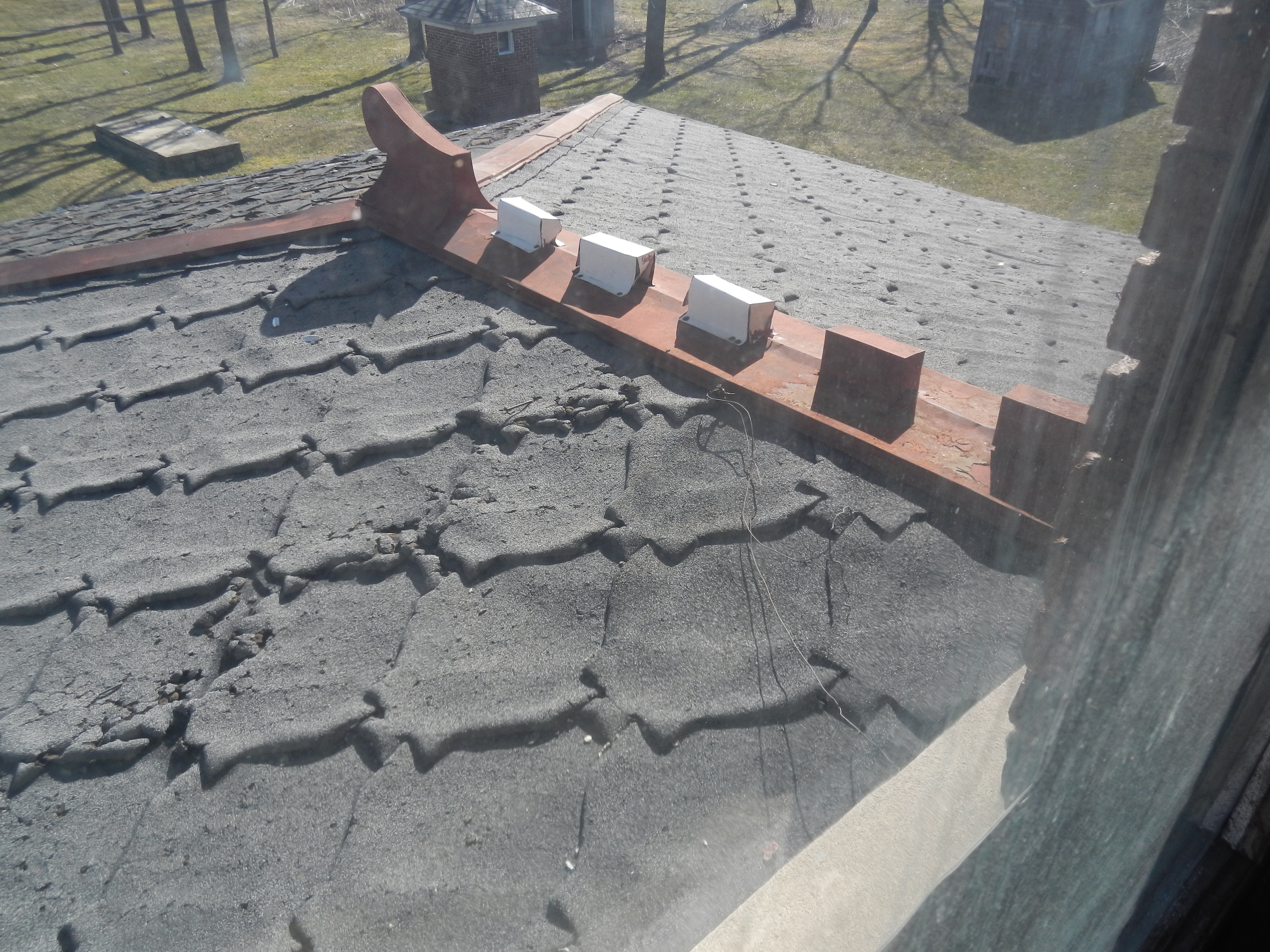 The original roof on the house was slate. For unknown reasons, it failed and was replaced in the 1980s. The fancy dentillated ridge cap was preserved, and placed over the shingled ridge.